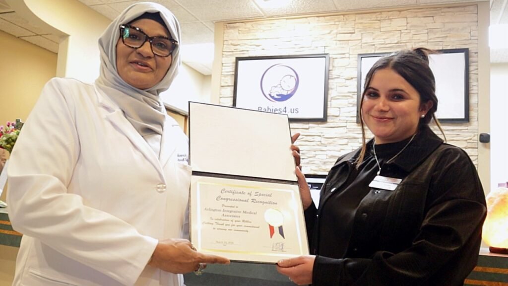 A representative from Congressman Jake Ellzey, 6th Congressional District, presented a commemorative plaque to Dr. Shabana Parvez in recognition of the new venture.